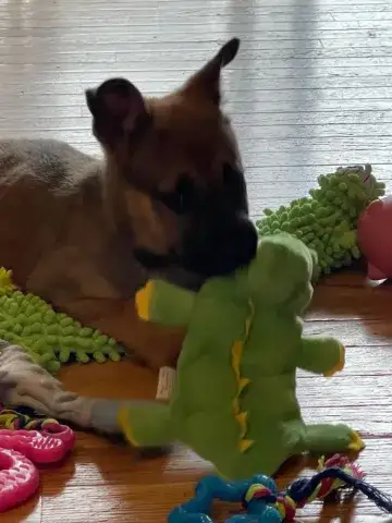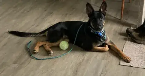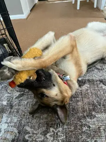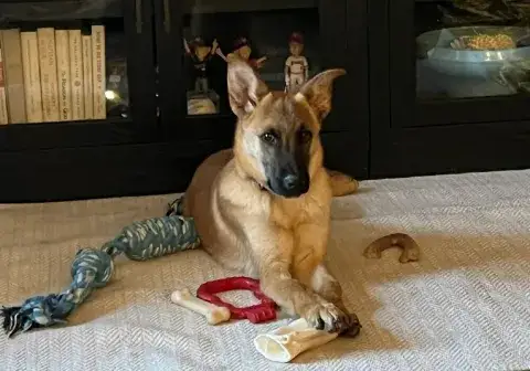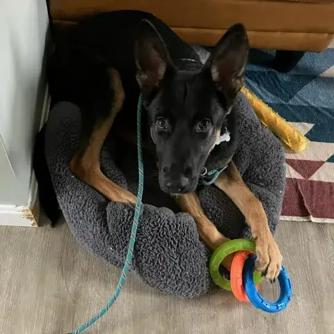 Hunter is a young, intelligent, and affectionate guy. He loves romping around outside and is learning about the joys of toys. Still discovering the ins and outs of living in a household, Hunter will benefit greatly from clear structure, routine, and leadership. We do not know anything about Hunter's past, but we do know that his future is bright with MAGSR. As is true of all young shepherds, it is critical that Hunter's family continue his socialization. Opportunities to learn about new people, animals, and environments will help Hunter further develop his confidence in the world around him. It is also essential that Hunter participate in training. Not only will training help Hunter develop a strong, healthy bond with his forever family, but it will also help him grow up to become a good canine citizen. If this sweetheart seems like the right match for your family, ask to meet him today!