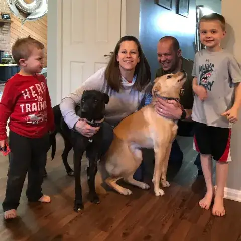 Jackie and her family - Axel, Gypsie, Genie, Sally, and Birdie - are victims of cruelty and neglect. All six dogs were living in horrific conditions. Chained in shower stalls, living in filth, abused, and starved, they endured unimaginable suffering at the hands of their owner. When word of their situation spread to local authorities, all 6 dogs were confiscated and charges were brought against their owner. Recognizing that these dogs would need significant support, a plea went out to see if they could be moved to the safety of a rescue. MAGSR answered that plea and immediately began working with local groups and animal services to get all six dogs the resources needed (medically and socially) to begin to move forward.
