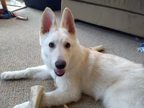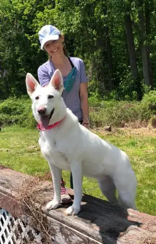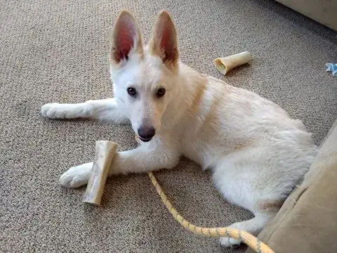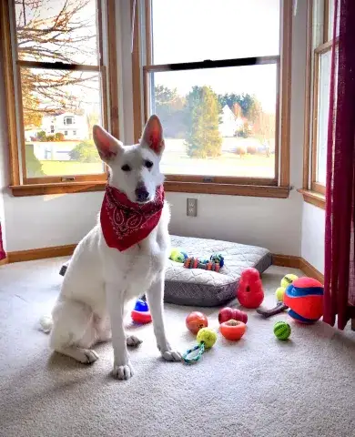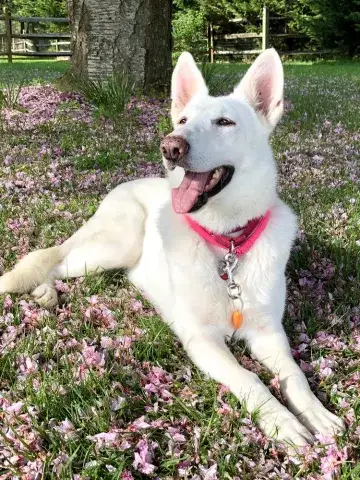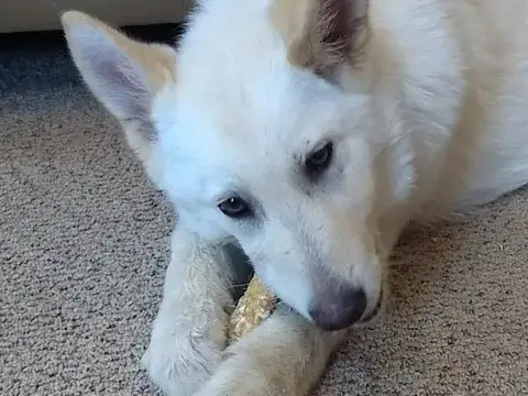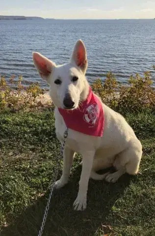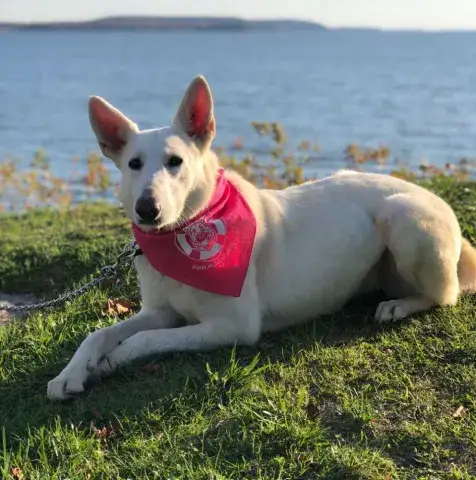 Niner is doing very well in her foster home. She’s very energetic and playful. Niner loves her chew toys, but doesn’t chew on anything she’s not supposed to. Niner is also very affectionate and likes to be with her humans all the time. She loves to cuddle up, and thinks at times that she is a lap dog. She really loves belly rubs. If Niner sounds like a good fit for your home, ask to meet her.