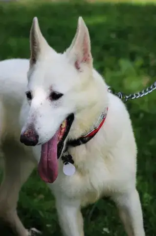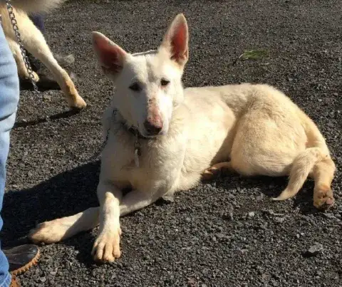 Buzz came to us after his person passed away and he ended up in a shelter. He lived with 3 other dogs and enjoys the company of other dogs. He is underweight and needs to gain about 15 lbs., nothing that good nutrition and regular meals won't fix. He can be a little skittish when first meeting new people, but in no time at all he will be smothering you with kisses and love. Training and structure will help him build his confidence and teach him good manners. He has obviously never spent time on a leash, so he is learning some leash skills. He currently has some hair loss and a skin infection that is being treated, but he doesn't take away from how handsome he is.