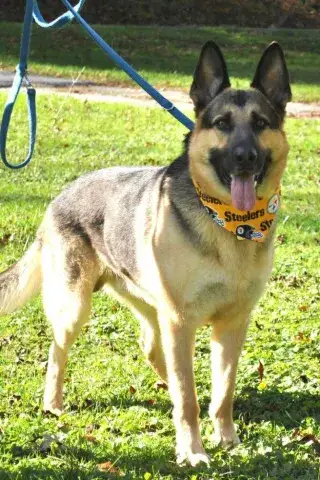 Ozzie's former person took ill and was no longer able to care for  him.  He was brought to the VA area by a family member and is now in our care looking for his forever family.  Ozzie is a very big boy at 94 lbs  He has undergone formal training but will require further training with his new family.  He has not lived with dogs before but did well meeting another German Shepherd during our evaluation.  Ozzie does have the tendency to herd (nip at) children, for this reason we feel it is best that he not be placed in a home with young children.  A boy of this size can be intimating to small children and he could also accidentally knock them down.  For the most past Ozzie's former person exercised Ozzie on daily 2 mile walks and lots of games of fetch.  Daily exercise is key to  keep energy in check, so please be sure you have the time to commit to his exercise needs, training and of course a lifetime of love and care.
