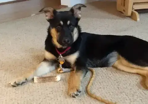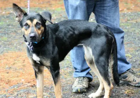Daina's test results revealed that she  has EPI, Exocrine Pancreatic Insufficiency.  This is caused when the pancreas does not produce enough enzymes to properly digest food.  This is very easily treated by adding enzymes to each meal which helps the body digest food.  More information can be found at epi4dogs.com along with before and after pictures of dogs that have EPI. Daina is now receiving the enzymes she needs and will begin to gain weight.  Please do not let EPI deter you from considering Daina, she deserves a family to love and care for her and in return she will give you her devotion. , Daina is doing so very well in her foster home and is definitely stronger and putting on weight now that she has the enzymes she needs for her food. Daina is a smart, playful, active, curious and fun girl. Her playful personality is really emerging now that she feels better. Daina loves to play tug and will also retrieve a ball thrown for her and will sit immediately when waiting for it to be thrown again.  She is friendly but alert and will alert her foster mom when she hears unexpected noises, but Daina is a pretty quiet dog in general. Daina is very well behaved and housebroken. She is learning obedience commands and leash manners and takes easy corrections well - some training will help quickly teach her the skills she needs to be a good canine citizen. Daina is just a wonderful, sweet, playful young girl waiting to make some family very happy!    , Hi - I’m Daina! I’m a little over 1 year old, past the puppy days but so full of fun!  I sit, walk well on a leash, play with other dogs and kids very nicely, love my crate, and am a really happy dog.  I do have one easily managed issue: I need to have enzymes sprinkled on all my food 20 minutes before I eat, to help me digest it and stay healthy.  It’s called EPI, or exocrine pancreatic insufficiency, (which you can look up online very easily), but other than that, I’m a normal, happy, fun young girl looking for my forever home.  I’ve met other dogs, horses, and kids here on my foster’s farm, and I’m friendly but alert. I don’t bark much at all, unless I hear something that just doesn’t sound right - then I’ll let you know. I like to play ball and tug, and go for walks anywhere you want to take me!  Please consider me when you are looking for a dog you can love forever - I’m kind of a sweetheart!