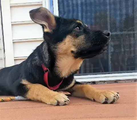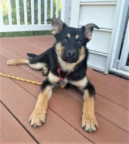 Aria and her sister Allie came to us from a shelter where they had been surrendered.  We are told that mom is a purebred GSD and dad is purebred Lab.  At 16 weeks old both girls have a whole lot to learn.  It is never too soon to start basic obedience training, as socialization with other dogs and people is very important, along with learning good puppy manners.  Puppies will chew things, have accidents, get into things and have lots of energy, so please be sure you have the time and patience it takes to raise a puppy.