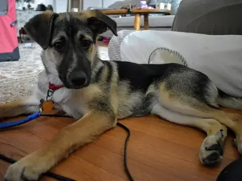 Allie and her sister Aria came to us from a shelter where they had been surrendered.  We are told that mom is a purebred GSD and dad is purebred Lab.  At 16 weeks old both girls have a whole lot to learn.  It is never too soon to start basic obedience training, as socialization with other dogs and people is very important, along with learning good puppy manners.  Puppies will chew things, have accidents, get into things and have lots of energy, so please be sure you have the time and patience it takes to raise a puppy.
