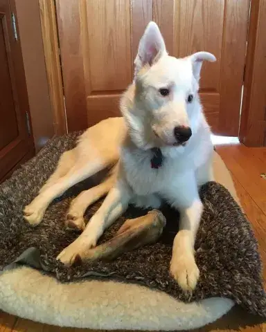 Otto is continuing to make progress; he has mastered stairs and is getting calmer going through doorways. He gets along well with the four large GSDs in his foster home. When Otto first arrived in his foster home, he would constantly hide in the back of his crate and had to be urged out for any activities. Otto has become much more confident over the last two weeks; he is comfortable wandering the house, taking walks around the property and prefers to nap in the corner of the living room rather than in his crate. Over the last couple of days he started to play with chew toys and is taking tentative first steps playing fetch. Although shy with new people, he is very affectionate and attentive with his foster.