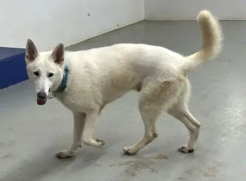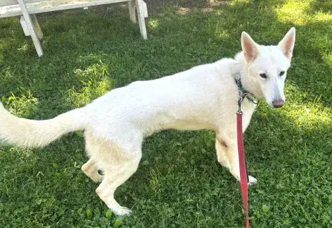 Handsome Zeus was picked up as a stray and brought to a local shelter. Upon his arrival staff members fell in love with this big, beautiful boy. An immediate staff favorite, Zeus enjoyed interacting with volunteers as it was clear he had been well socialized with people. Although Zeus was noted to be big and friendly, it was also noted that he needed medical support. Zeus was underweight, filthy, missing a significant amount of hair on his back-end, covered in fleas, and suffering from an allergic reaction from the fleas leaving him with open sores. It is not known how long Zeus had been suffering, but it is evident that this level of need did not happen overnight. Although shelter staff began addressing his needs, it was clear that Zeus would be most successful if placed with a rescue so that his specific needs could be met. When MAGSR learned that Zeus needed a safe place to land in order to move forward, our team immediately stepped forward to help.