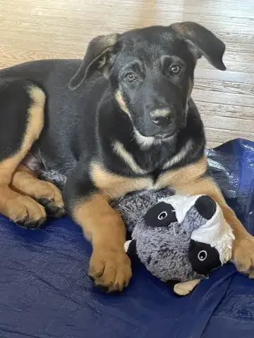 Sheppy is a friendly and playful guy. He is a big fan of plushy toys and hopes that his forever family has plenty of them in the household. Sheppy has done a nice job in a large shelter and seems comfortable with other dogs. However, as is true of many shepherds, Sheppy has high-drive. He is looking for a household without cats or other small animals. Although clearly socialized with people, Sheppy did not receive the training needed to meet with success. He will need to learn leash manners and the importance of keeping his paws on the ground. Fortunately, our team has already begun working with Sheppy so that he better understands the ins and outs of becoming a good canine citizen. Training is essential for Sheppy's success. Training will not only help Sheppy develop a strong, healthy bond with his forever family, but it will also help him develop the skills needed to become a stable and confident canine citizen. Sheppy is looking for a forever family that will provide him with routine, structure, patience, and leadership. This set-up is crucial for success with all shepherds. If you are looking for an active, playful, and intelligent guy, look no further than Sheppy!