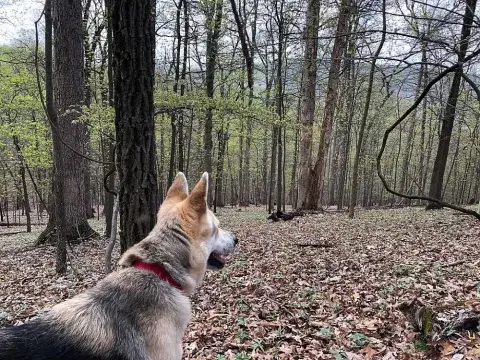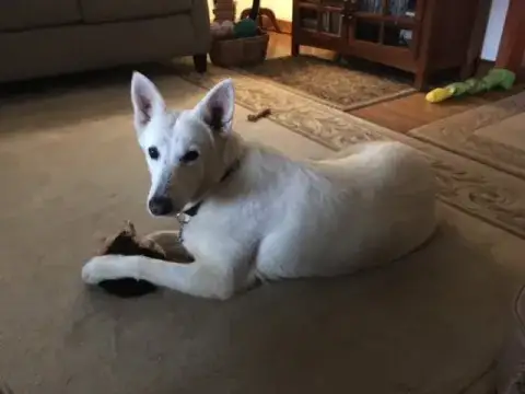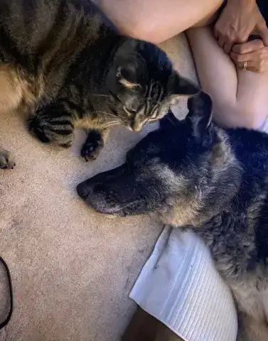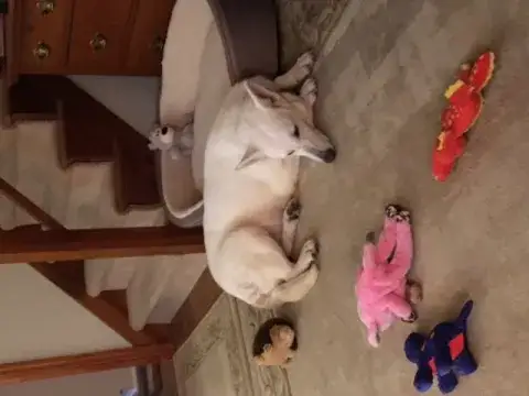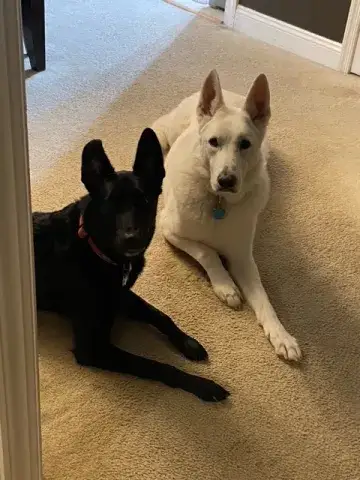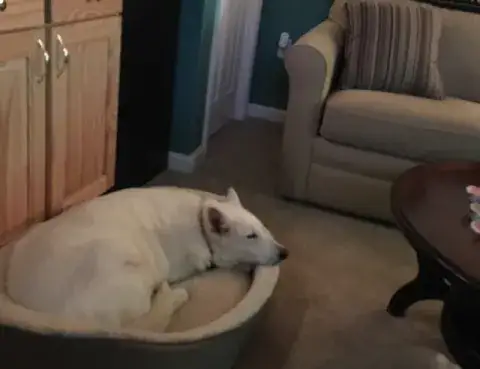 Sammie was adopted on March 14, 2021, as half of the “bonded pair” Kota and Birch (renamed Sammie and Bosco).  She was an older dog, possibly as old as 10 years.  She had some physical problems and had recently had surgeries prior to adoption.  She was doing very well though and seemed to thoroughly enjoy the 6 months that she was living here.  As the pictures show, she and her buddy Bosco loved their naps and they enjoyed monitoring the back yard for deer. She also enjoyed the two walks per day in the woods, up and down the hills, and along the lane.   She was a beautiful and very affectionate shepherd who quickly learned commands.  My hope is that in her early years, she was owned by someone who cared for her.  We miss her very much.