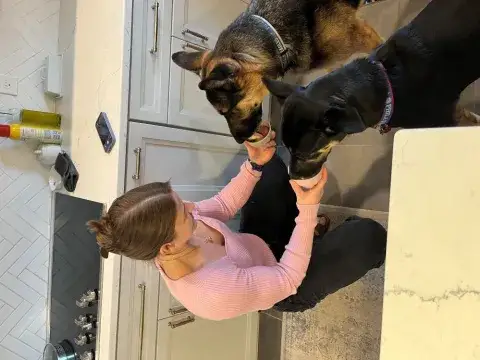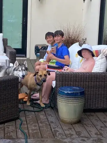 Jo just hit his gotcha day on March 15 and celebrated in style with vanilla ice cream. He’s the epitome of a little sibling keeping us all on our toes and providing endless snuggles. He loves to let off steam in the yard with all the zoomies and then chasing his brother Nick while he plays fetch. His favorite activity is sitting by the front window to keep tabs on what dogs are making their rounds in the neighborhood.