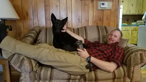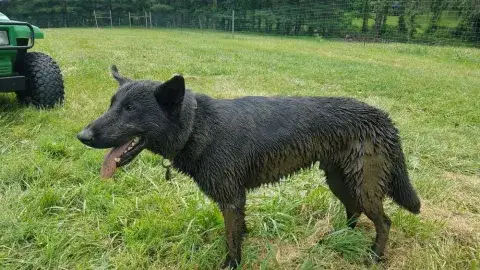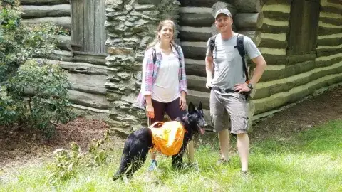 Loki is a farm dog. We adopted him on March 5, 2017. He loves running, chasing butterflies, getting muddy, getting hosed off, running more, and rain or shine or snowstorm he always wants to be outside with me. I work out in a vineyard with 20 acres surrounded by 12 foot high deer fence. He has free reign to go wherever he wants. Short description of the photos. My wife Sarah and I on a hike up in PA. Loki carried his own food and water and had a blast! Loki on an average summer day at work after taking a mud bath. He seems to think it is good for his skin because he does it every day, and if I hose him off he immediately goes and gets muddy again! Loki runs everywhere. He also like trying to catch butterflies and can easily amuse himself scaring up bugs and leaping into the air trying to eat them. Loki at the lake. Glamour shot!