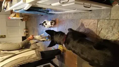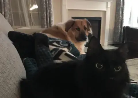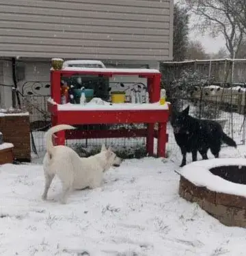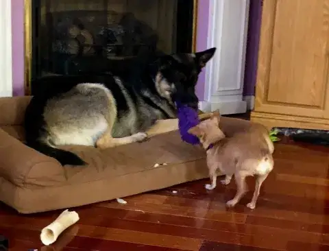 She plays well with our Chihuahua and a Shih Tzu mix. Taco the Chihuahua seems to feel she’s the same size as Duchess. Dutchess and Taco frequently play tug-of-war. She and shitzu Jingle are less fond of each other but do have fun running up and down the hill in the back yard, chasing squirrels and barking at birds.