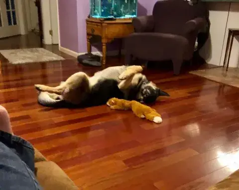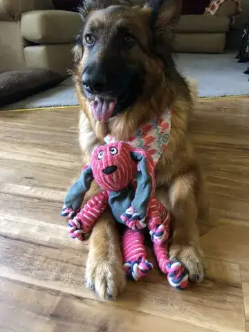 Jackie has settled in quite well in our house. She and Ellie (our other rescued GSD) get along very well, as you can see in the second pic. Jackie loves to snuggle with us on the sofa and watch movies. She and Ellie get to run and play  in the yard every day and get special treats from their grandparents on holidays. They get a bark box every month with fun toys to keep them entertained and lots of yummy treats.
