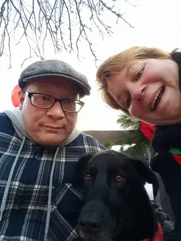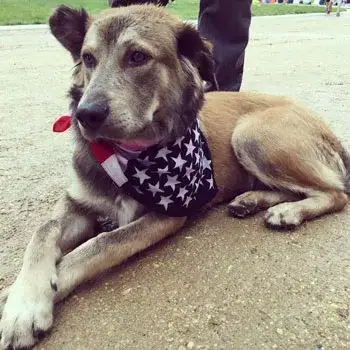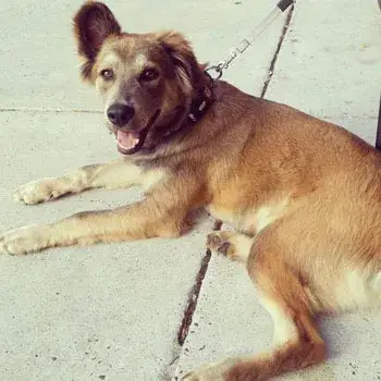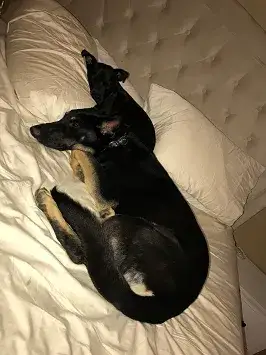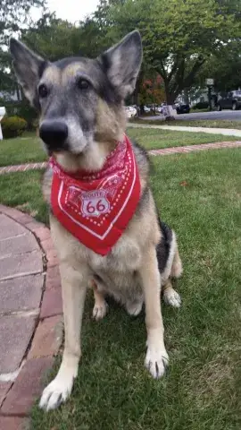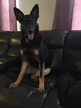 We adopted Bella in July 2011. We did not change her name. She had come from Detroit - her owner surrendered her and sent her via airplane to MAGSR. We were her foster family, and then she stayed!  Bella has some allergies (leaf mold is her worst irritant) and immunotherapy didn't work for her. May - November she is perfectly fine; from about Thanksgiving until Mother's Day she stays on Apoquel to keep down the itching.  Other than that, Bella is a super smart, cuddly, athletic dog. She is slowing down a little at age 8. Now a 2-3 mile walk actually puts a dent in her energy, whereas a few years ago that would have just been the warm-up! From her behaviors and her appearance once she filled out, I strongly suspect she is a Belgian Malinois mix; probably mixed with a pointer or other tall hound.  This photo is from a trip we took this summer with both Bella and her adopted bro Chief. Chief is a miracle boy. We adopted him from our county shelter three years ago at age 10. On March 5, 2015 he collapsed after eating breakfast. Later that day he had emergency surgery to remove his spleen. Biopsy showed he had had a bleeding tumor which was a hemangiosarcoma. Vets at the emergency center said he had maybe 3-6 months to live.   That was 18 months ago, and now at age 13 he still walks a couple miles a day with us, chases balls like a puppy, and wrestles with Bella as much as she can stand!  Our trip was a road trip from Maryland to Niagara Falls (yep - the pups went international!) and then out to Wyoming and back.  Over 5000 miles in two weeks. They traveled like champs, and we found parks, walking trails, pet-friendly restaurants and motels all across the country! :)  I think this photo was at about day 8 of the trip, on the front porch of a KOA camping cabin, as the dogs were getting a little suspicious about loading up into the SUV yet again...  Carolyn and Dan Matthews