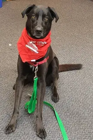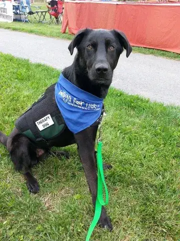 Hi, my name is Jax! I am a three year old black lab/German shepherd mix. I was found with my four sisters and mom when I was less that a month old and was fostered by Mid-Atlantic German Shepherd Rescue. When I was 4 months old, I was adopted by my mom and dad on January 10, 2014. It was love a first sight (I have that effect on humans). Both mom and dad are big believers in well behaved puppies, so they started me on training. I competed basic, intermediate, and advanced. I also got my Canine Good Citizenship certificate. Mom and dad make sure I get to play with lots of other dogs by going to K-9 Camp daycare a few times a week. When I was a year old, mom signed up to join Wags for Hope. She went to orientation and the education classes without me then we had the evaluation, which I got to go to. She was very nervous because I'm a wild dog at home (or so she claims), that she made sure we went last so no one would be there to see me act up. Boy I fooled her! I was on my best behavior and ROCKED the exam. Since then I've been visited nursing homes, assisted living homes and the READ program in libraries. I really enjoy people so mom decided to test for Level II which would allow me to visit FMH. We tested for Level II in November 2016 and once again I was a very well behaved pup and passed the evaluation.  We've been visiting the hospital and I love seeing the patients and staff. Mom is very proud of me and constantly brags on what a good pup I am. I am very lucky to have a wonderful family and a job I enjoy.