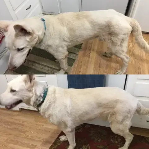 Hi there, We wanted to share Jax's progress with us. To say we have absolutely fallen in love with Jax is an understatement. He is the sweetest, most loving, wonderful addition to our home. He brings us so much joy and we can tell how happy he is to have a good home. I'm attaching a few photos to show his progress in getting to a healthy weight (he LOVES to eat) and how much his adopted-sister Ava loves having him around. Thank you so much for everything you do!!   Best, Sarah