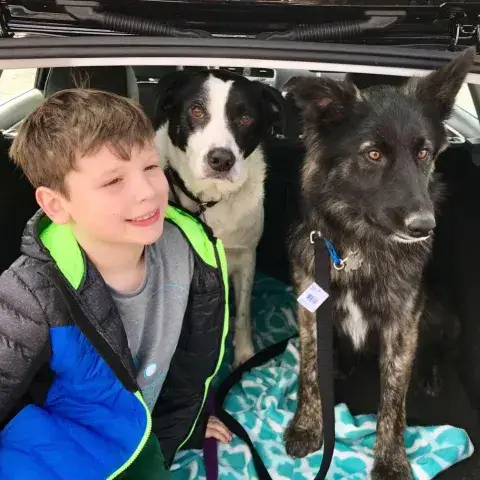Hi. This is John Grgurich. My wife, son, and I recently adopted Tate. He's working out beautifully, and his foster, Nancy Stett, was a big help in the process. I've already communicated how well Tate, now Komet, is doing with us, but I also wanted to pass along a pic and a video of the lad to you; I know MAGSR likes to post these kinds of things on its site.   Cheers, and thanks again for all you do. Komet is a good lad, and we're happy to have him.   John   p.s., The pic is my son Jack, with Komet and Floss our Border Collie mix, in the back of my wife's car.