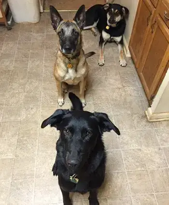 Hi- We have 4 dogs; 3 of them are MAGSR alumni...we have Maxi (AKA Maxine) a long haired shepherd who we adopted in Dec. 2014, Fargo (FKA Garbo) a black lab shepherd mix, adopted -by our Malinois, Geiger, in Nov. 2015, & now most recently Wilco, (AKA Willoughby) a shepherd malamute cross, adopted in May 2016.  Fargo keeps watch by standing on our table on the deck.  All the dogs love to play, play, play & chase each other around the yard & house!