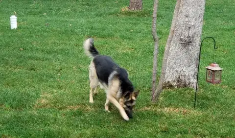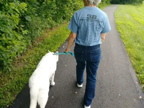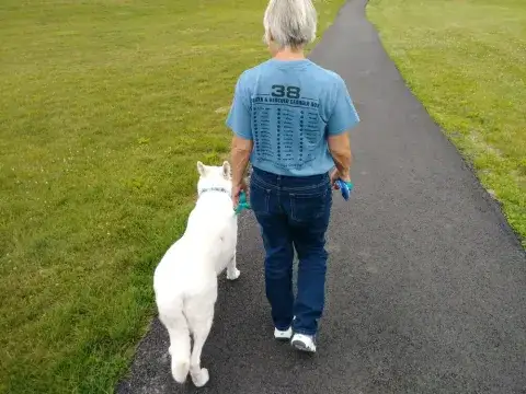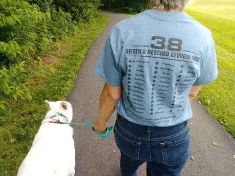 We went to the park today for a walk. Ann wore her Georgia 38 shirt from Mid-Atlantic German Shepherd Rescue. It has the names of all 38 German Shepherds rescued from the Georgia Puppy Mill and taken in by MAGSR printed on the back, including Nia's.   Look at how thick and fluffy her tail has gotten!